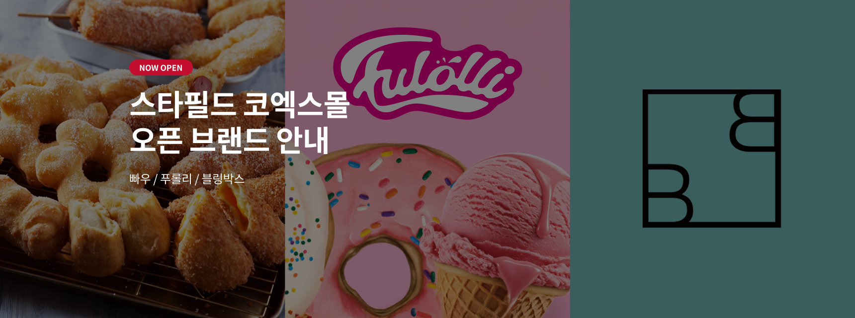 스타필드 코액스몰 모바일 웹사이트 바로가기 > at STARFIELD COEXMALL 스타필드 코엑스몰의 이벤트&쿠폰 10월의 별마당 도서관 소식 10월의 별마당 도서관 소식 09.29(월) - 10.31(금) 스타필드 코엑스몰 10월의 브랜드 행사 스타필드 코엑스몰 10월의 브랜드 행사 10.01(수) - 10.31(금) 스타필드 코엑스몰 10월의 이벤트&혜택 스타필드 코엑스몰 10월의 이벤트&혜택 10.01(수) - 10.31(금) 코엑스몰 SO클럽 서비스 안내 코엑스몰 SO클럽 서비스 안내 01.01(월) - 12.31(화) 책으로 소통하는 문화 감성 공간 별마당 소식 시처럼 음악처럼 낭만 가득한 삶“ 별마당 도서관 소식” 별마당 소식 보기 별마당 아트 프로젝트 별마당 도서관의 가치와 철학을예술 작품으로 표현합니다. 별마당 아트 프로젝트 보기 별마당 도서관 스토리 가슴에 별을 품은 이들을 위한 다양한 이야기“별마당 도서관 공식 SNS 채널” 별마당 도서관 스토리 보기 SPECIAL FIELD 스타필드 코엑스몰만의 특별한 공간 BEST CAMPAIGN 스타필드 대표 행사 스타필드, ‘세상에서 가장 큰아이’대한민국 광고대상 ‘대상’ 수상! 지금까지 이런 축제는 없었다!스타필드 쓱데이 페스티벌! 스타필드 하남, 국내 쇼핑몰 최초‘LG U+ 3쿠션 마스터스 대회’ 개최 COEX 전시 코엑스에서 진행되는 다채로운 전시 전시회 일정 바로가기