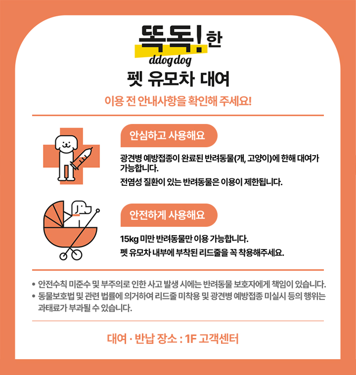 목줄은 안전을 위해 1.5m 이내로 조절하여 고정 후 출입해주시기 바라며, 반려동물의 배설물 발생 시 소유주의 처리가 필요합니다.