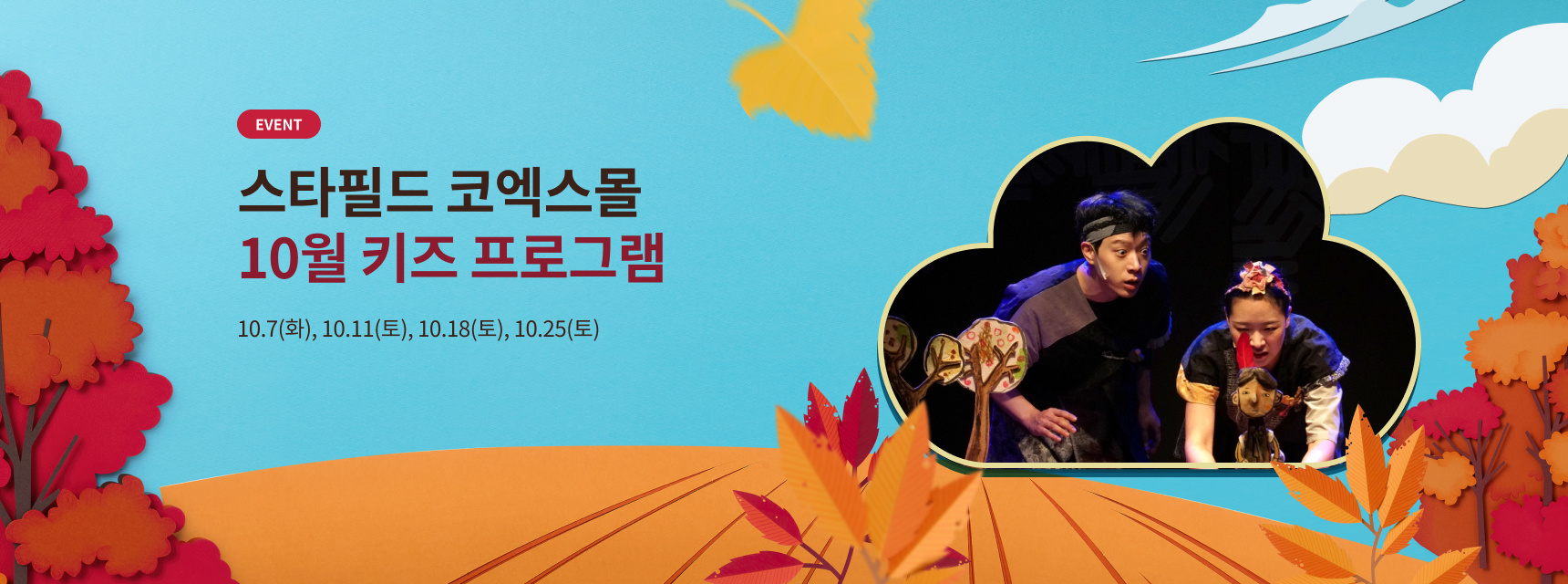 10월의 별마당 도서관 소식 10월의 별마당 도서관 소식 09.29(월) - 10.31(금) 스타필드 코엑스몰 10월의 브랜드 행사 스타필드 코엑스몰 10월의 브랜드 행사 10.01(수) - 10.31(금) 스타필드 코엑스몰 10월의 이벤트&혜택 스타필드 코엑스몰 10월의 이벤트&혜택 10.01(수) - 10.31(금) 코엑스몰 SO클럽 서비스 안내 코엑스몰 SO클럽 서비스 안내 01.01(월) - 12.31(화)