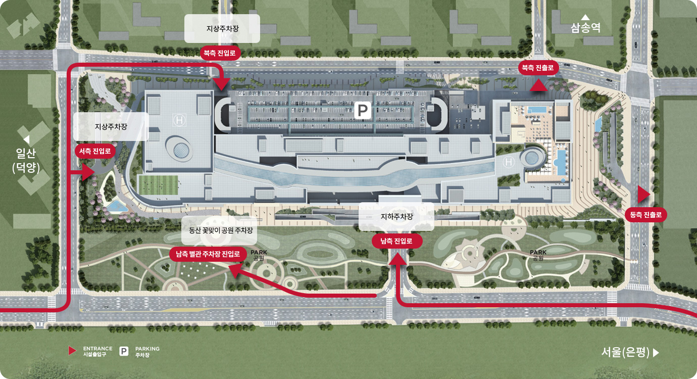 북쪽 방면: 건물 상단을 따라 주요 도로가 있으며, 일산(덕양) 방면으로 연결됩니다. 북측 진입로는 건물로 들어오는 진입로이며, 북측 진출로는 건물에서 나가는 진출로입니다.