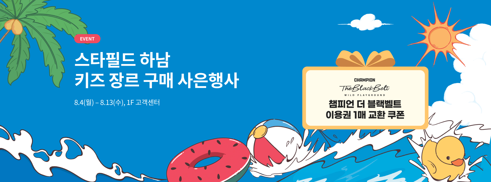 스타필드 하남 모바일 웹사이트 바로가기 > at STARFIELD HANAM 스타필드 하남의 이벤트&쿠폰 스타필드 하남 11월의 브랜드 행사 스타필드 하남 11월의 브랜드 행사 11.01(토) - 11.30(일) 스타필드 하남 11월의 이벤트&혜택 스타필드 하남 11월의 이벤트&혜택 11.01(토) - 11.30(일) 신규 오픈 브랜드 신규 오픈 브랜드 11.01(토) - 11.30(일) 해외유명브랜드 장르 특별혜택 해외유명브랜드 장르 혜택 특별혜택 01.01(월) - 12.31(화) SPECIAL FIELD 스타필드 하남만의 특별한 공간 BEST CAMPAIGN 스타필드 대표 행사 스타필드, ‘세상에서 가장 큰아이’대한민국 광고대상 ‘대상’ 수상! 지금까지 이런 축제는 없었다!스타필드 쓱데이 페스티벌! 스타필드 하남, 국내 쇼핑몰 최초‘LG U+ 3쿠션 마스터스 대회’ 개최