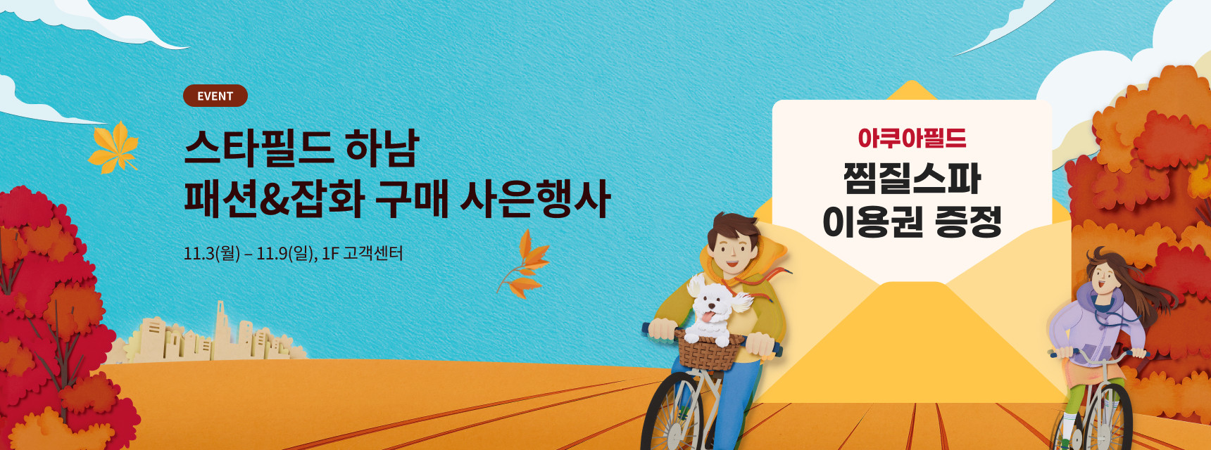 스타필드 하남 모바일 웹사이트 바로가기 > at STARFIELD HANAM 스타필드 하남의 이벤트&쿠폰 스타필드 하남 11월의 브랜드 행사 스타필드 하남 11월의 브랜드 행사 11.01(토) - 11.30(일) 스타필드 하남 11월의 이벤트&혜택 스타필드 하남 11월의 이벤트&혜택 11.01(토) - 11.30(일) 신규 오픈 브랜드 신규 오픈 브랜드 11.01(토) - 11.30(일) 해외유명브랜드 장르 특별혜택 해외유명브랜드 장르 혜택 특별혜택 01.01(월) - 12.31(화) SPECIAL FIELD 스타필드 하남만의 특별한 공간 BEST CAMPAIGN 스타필드 대표 행사 스타필드, ‘세상에서 가장 큰아이’대한민국 광고대상 ‘대상’ 수상! 지금까지 이런 축제는 없었다!스타필드 쓱데이 페스티벌! 스타필드 하남, 국내 쇼핑몰 최초‘LG U+ 3쿠션 마스터스 대회’ 개최