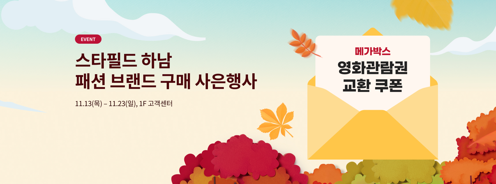 스타필드 하남 11월의 브랜드 행사 스타필드 하남 11월의 브랜드 행사 11.01(토) - 11.30(일) 스타필드 하남 11월의 이벤트&혜택 스타필드 하남 11월의 이벤트&혜택 11.01(토) - 11.30(일) 신규 오픈 브랜드 신규 오픈 브랜드 11.01(토) - 11.30(일) 해외유명브랜드 장르 특별혜택 해외유명브랜드 장르 혜택 특별혜택 01.01(월) - 12.31(화)